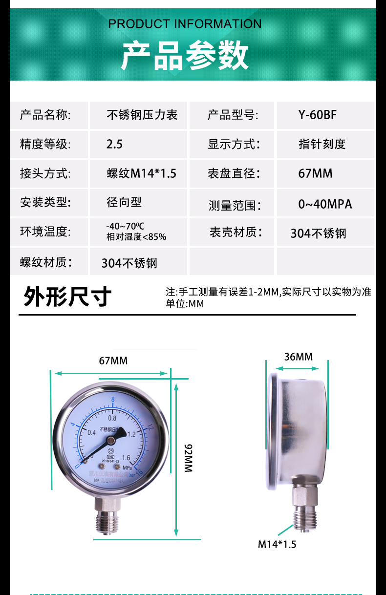 Y60BF不銹鋼壓力表